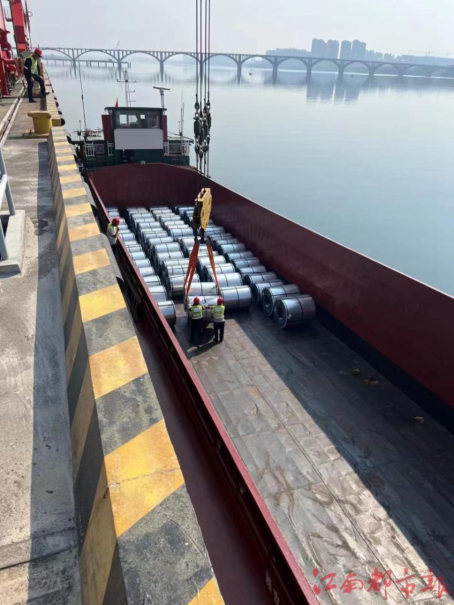 江南都市報訊 周逸程、全媒體記者章娜、實習生付鉦蘇、陳亦夫攝影報道:7月27日6時28分,吉安港新干港區河西綜合碼頭開啟新余鋼鐵集團第一批貨物的起吊裝船,標志著新干港區河西綜合碼頭正式投產開始試運營。