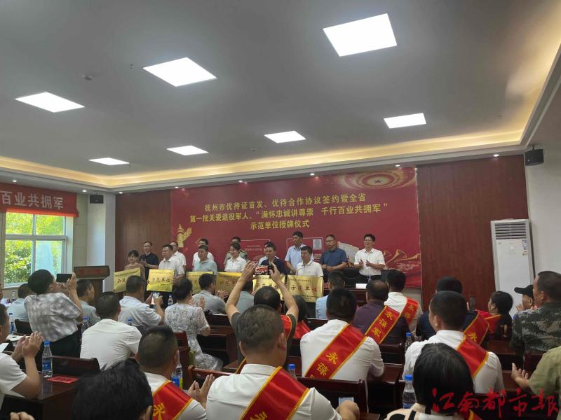 江南都市報訊 揭賓耀 全媒體記者舒曉燕攝影報道:9日上午,撫州市優待證首發、優待合作協儀簽約暨第一批關愛退役軍人示范單位授牌儀式活動舉行,為全省首批4家“滿懷忠誠講尊崇 千行百業共擁軍”示范單位,2家省級關愛退役軍人示范單位授牌,為退役軍人和其他優撫對象代表發放優待證。撫州市文廣新旅局、撫州市教育體育局等12家優待合作單位簽訂優待項目協議。