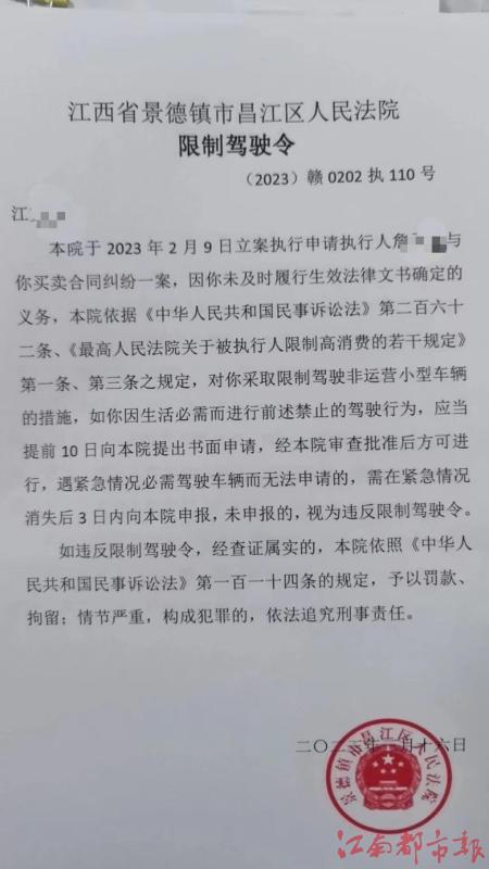 江南都市報(bào)訊 方劍、全媒體記者余文斌攝影報(bào)道:3月27日,記者從景德鎮(zhèn)市昌江區(qū)人民法院獲悉,該院于近日向江某某發(fā)出了該市首份“限駕令”,通過限制其駕駛非運(yùn)營性小型車輛的措施,達(dá)到有力打擊“老賴”,保障其他當(dāng)事人合法權(quán)益的目的。