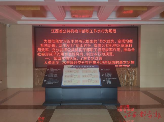 開展辦公區域節水宣傳,在主要各衛生間、辦公室飲水機旁等主要用水區域,大門口、各層樓梯口等顯著位置張貼節水宣傳標語,利用一樓電子顯示屏滾動播放《公民節約用水行為規范》《江西省公共機構干部職工節水行為規范》等節水知識,營造全局良好的節水氛圍。