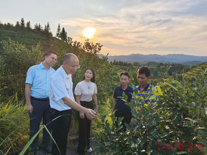 在龍?zhí)伶?zhèn)勝前村油茶基地,葉日山現(xiàn)場(chǎng)了解基地油茶管理和油茶產(chǎn)量情況,與種植戶面對(duì)面交流油茶追肥等生產(chǎn)管理細(xì)節(jié),分析油茶品種和產(chǎn)量,并有針對(duì)性地提出了改進(jìn)提升措施。座談會(huì)上,葉日山聽(tīng)取了定南縣林業(yè)局、不動(dòng)產(chǎn)登記中心的工作匯報(bào),了解了林權(quán)審核審批、工作流程及鄉(xiāng)鎮(zhèn)林長(zhǎng)辦人員配置和工作開(kāi)展情況,并與相關(guān)辦證人員和受邀已辦證的群眾代表親切交流,廣泛聽(tīng)取意見(jiàn)建議。