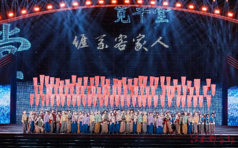 開門迎客的序章上,以龍舟鼓舞與情景講述《客從何來》,是對客家淵源的探索,更是全球客家人山水相依的結緣。開篇的客途為家,以光影音畫表演 、情景演唱以及非遺情景儀式表演《遷徙南渡》《圍屋之歌》《安家喜釀》時光瞬間被拉回至千年前,客家人的歷史徐徐展開。隨著時空轉換,巨幕上的圍屋連接古今,講述著客家人遷徙的歷史。客家文化流淌千年,圍屋燈火映照古今,客家山歌唱著綠水青山與金山銀山的故事,就此安居樂業。