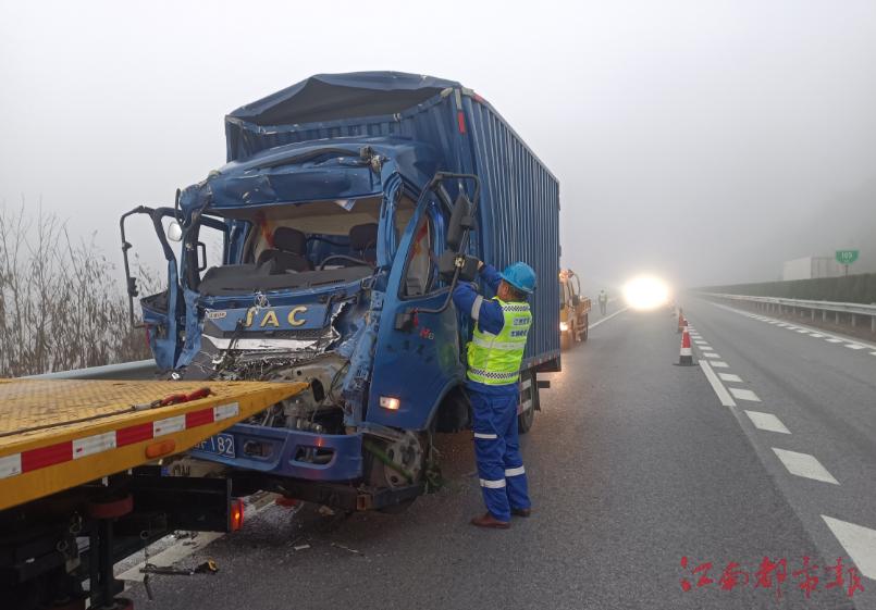 江南都市報訊 蔣曉芬、全媒體記者劉火兵攝影報道:1月4日, 一輛小型貨車行駛在寧定高速寧都方向時,司機因大霧天氣視線受阻剎車不及時,導致追尾前方貨車。省交投贛州管理中心贛州車輛救援大隊接到救援電話后,第一時間趕往現場救援,確保了道路暢通。