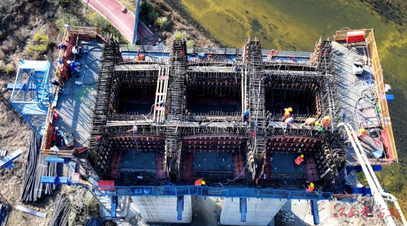 上河一號橋主橋為預應力砼連續剛構,上部構造采用變截面三向預應力單箱三室連續箱梁結構,引橋上部構造采用預應力先簡支后連續T梁結構,橋梁全長618米,最大墩高為32.85米。上部連續箱梁雙幅分別獨立采用掛籃懸臂澆筑法施工,箱梁縱向分段長度為(3×3+4×3.5+3×4m),箱梁墩頂塊件(即0號塊)總長8.0米,中跨、邊跨合龍段為2.0米,邊跨現澆段長度為4.0米。此次上河一號橋11#墩0號塊底腹板混凝土的順利澆筑,標志著項目工程推進邁出了穩步的一大步,為后續全力推進橋梁掛籃施工作業,掀起新一輪的施工高潮奠定了堅實的基礎。