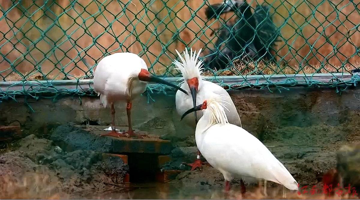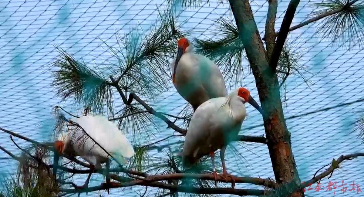 江南都市報訊 全媒體記者許南平攝影報道:1月18日,在龍虎山景區上清鎮沙灣村琵琶山基地,我省首次實施朱鹮野化放歸的8只國寶已經有了“早戀”跡象,大約有3對“戀人”了。記者注意到,成對的朱鹮時而親親嘴,時而互相梳理毛發,使得朱鹮繁育基地愛意濃濃。朱鹮,又名朱鷺,俗名紅鶴,素有“東方寶石”“稀世珍禽”“吉祥鳥”“美麗之神”“天下第一鳥”等美稱。已在地球上生存了6500萬年,說它是活化石毫不過分。被列為國際極危級、中國一級保護動物,承載著古老的文化氣息。江西是朱鹮種群重要的歷史分布地。經過前期調查和科學研究,國家林業和草原局2023年批準從陜西漢中朱鹮國家級自然保護區引入朱鹮到江西,20只朱鹮將分批“安家”鷹潭龍虎山,啟動首次在江西開展的朱鹮野化放飛實驗研究。這些遠道而來的朱鹮,會在網籠中逐步適應當地氣候環境,進行覓食、棲息、筑巢、繁殖等一系列自然行為,經過一段時間達到條件后,將被分批放飛野外。