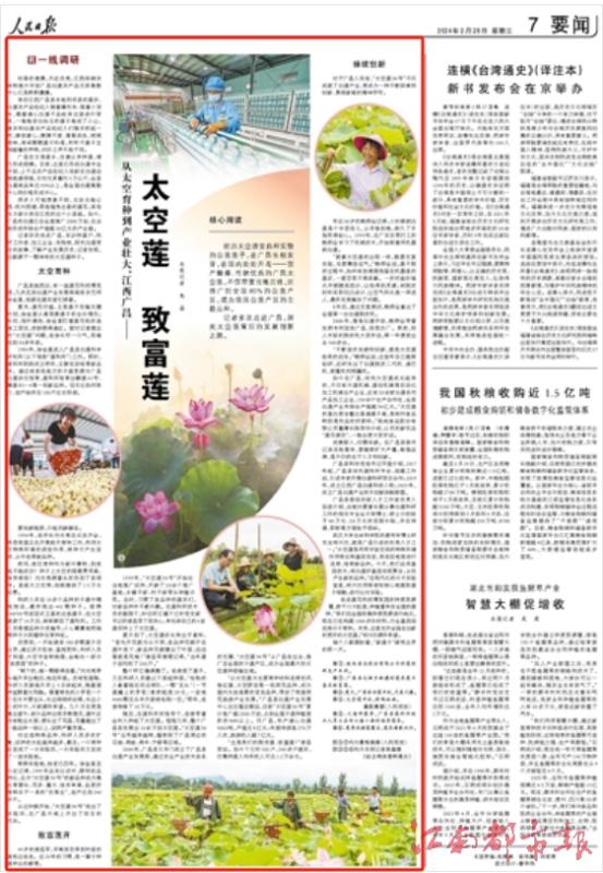 經歷太空誘變良種實驗的白蓮蓮子,在廣昌生根發芽,在國內處處開花——畝產翻番、性狀優良的廣昌太空蓮,不僅帶富當地百姓,還推廣到全國80%的白蓮產區,成為我國白蓮產區的主栽品種。