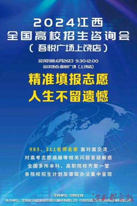 6月26日,“2024江西全國高校招生咨詢會——上饒專場”活動將在上饒吾悅廣場舉行,為全國各大高校和廣大考生搭建一個良好的信息溝通平臺,指導考生精準、合理填報志愿。