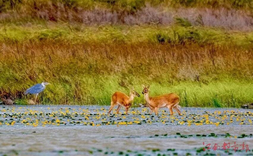 鄱陽湖候鳥保護區朱市湖幾只河麂悠然涉水。鄭文斌 攝